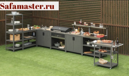 ***Лёгкость сборки и перестановки.Модули легко перемещать и устанавливать, что позволяет быстро менять конфигурацию кухни и экспериментировать с дизайном.***Разнообразие. В нашем ассортименте вы найдёте столы, скамейки, полки, шкафы для хранения посуды и продуктов, мойки, плиты, барбекю и другие функциональные элементы.