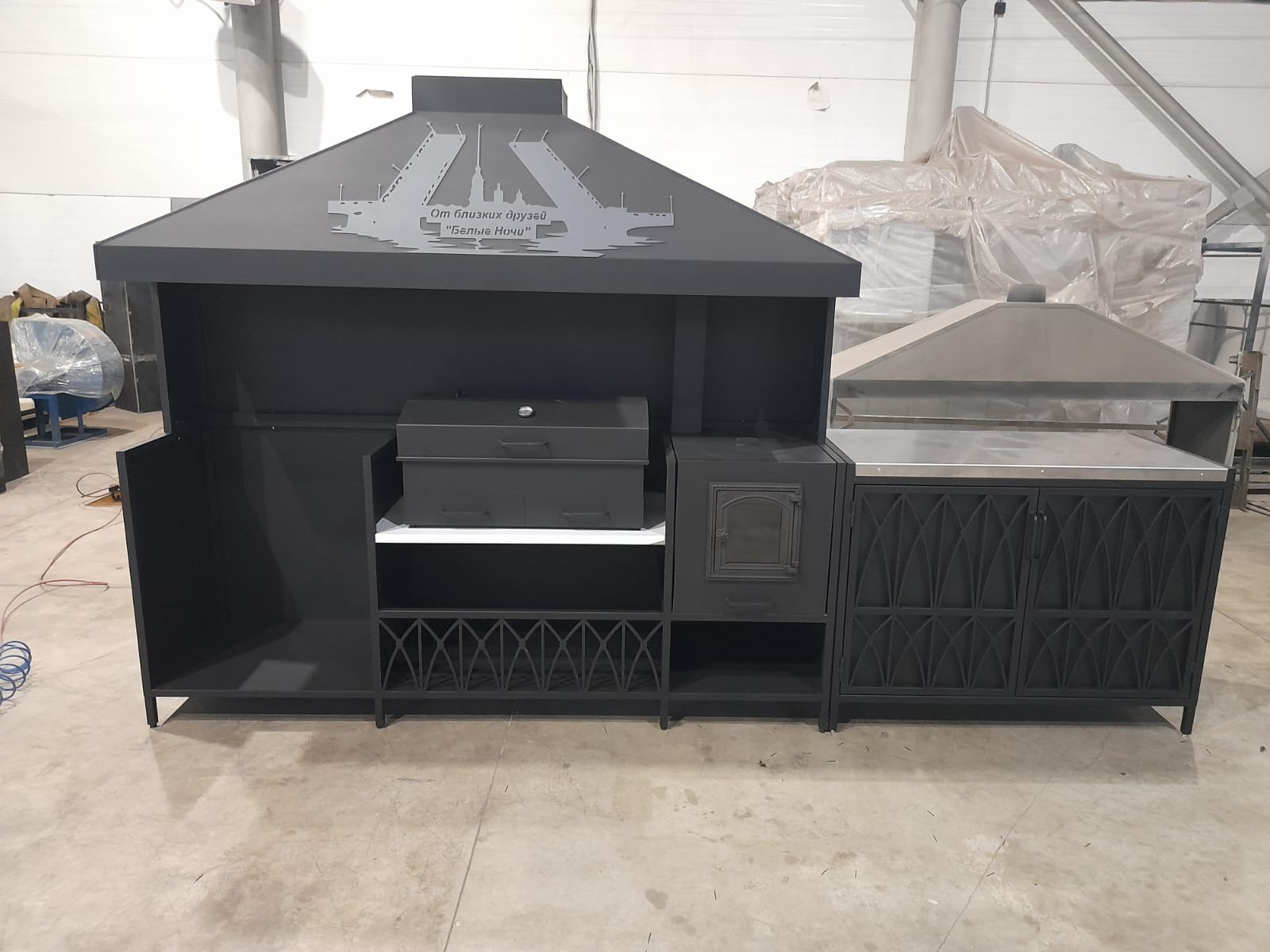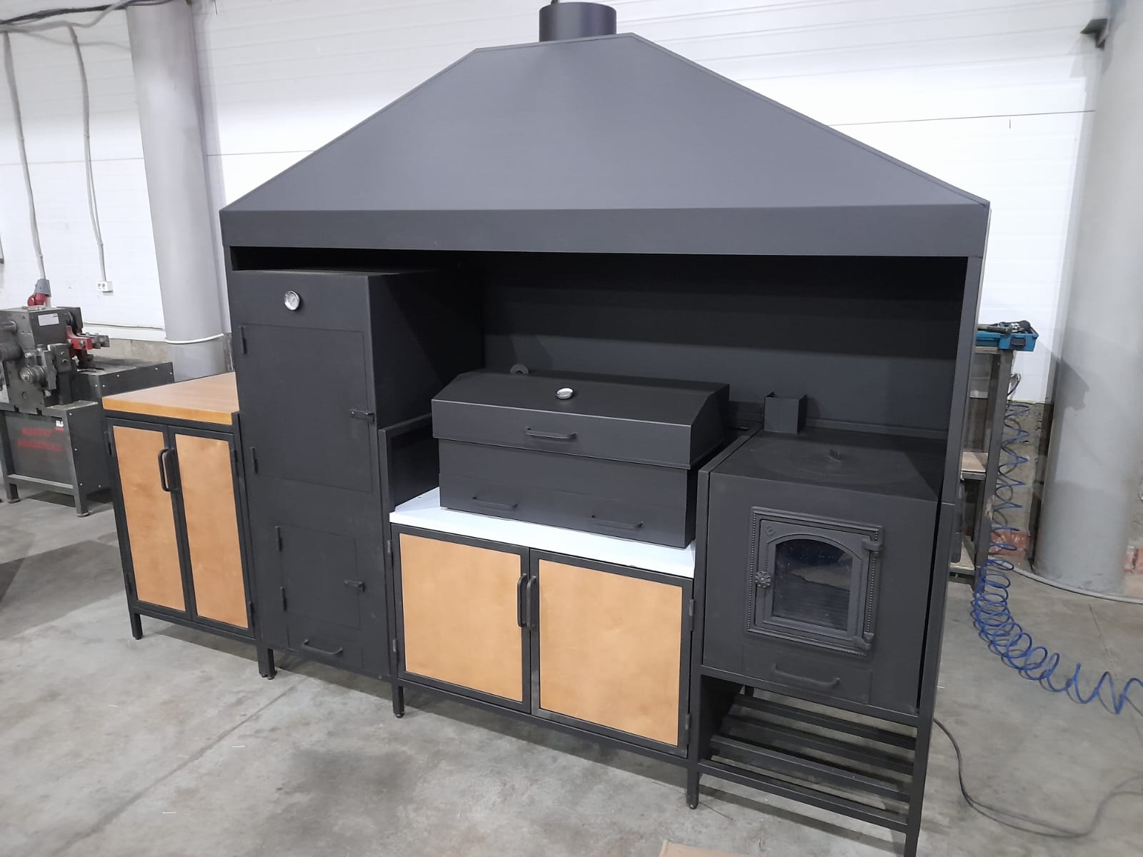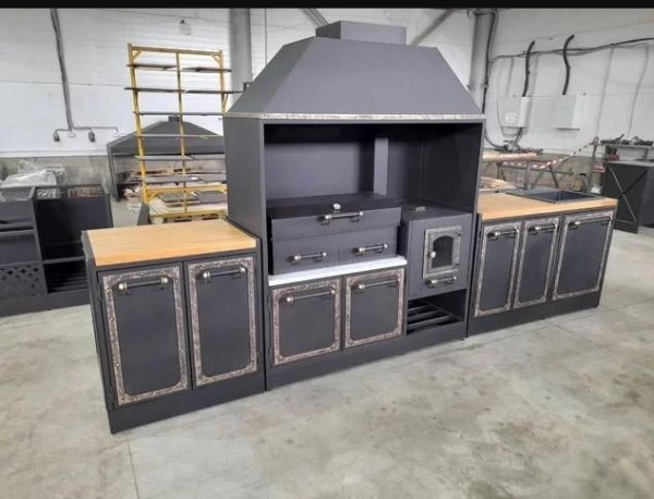 У нас можно купить мангальную зону из металла кованую и лофт для дачи и дома с деревянными/металлическими панелями, столешницами по вашим размерам. От конструкций маленьких с одним мангалом до современных больших модульных до 6 метров. У нас большие площади, потому можем сделать быстро очень большие конструкции и много.