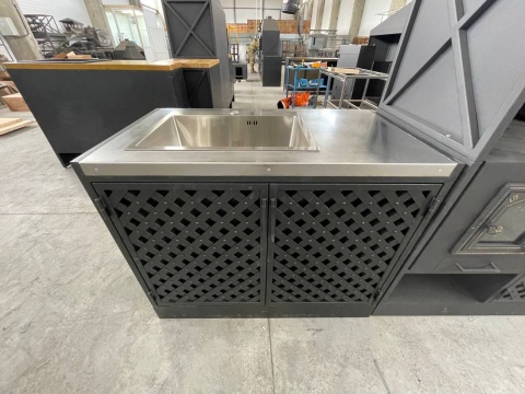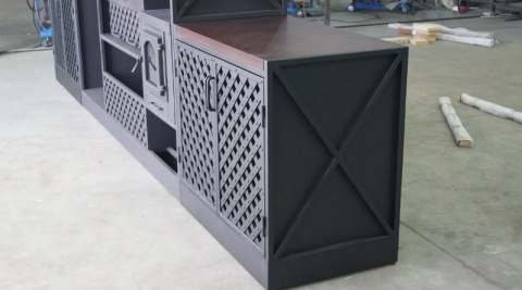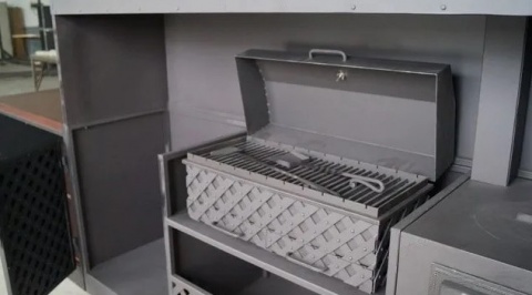 Размер меньше каркаса быть не может, в остальном можем сделать практически под любой размер, изменить цвет, дополнительно украсить фасад. Мангал имеет толщину 4 мм, он закрыт с 3 сторон, поэтому является безопасным. Толщину жаровни можем изменить.