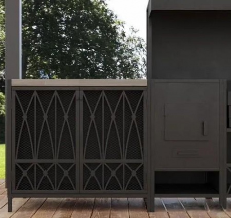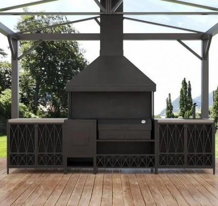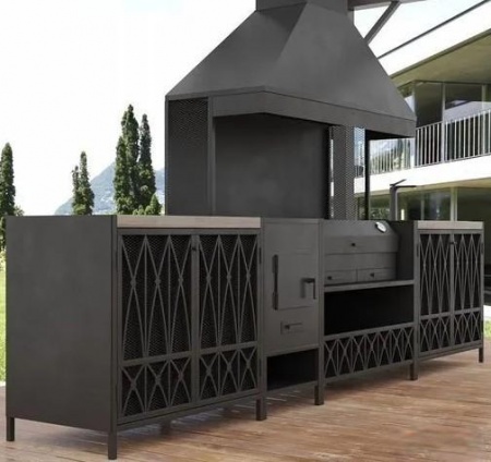 Модульная мангальная зона лофт из металла для дома, дачи(мангальный комплекс 28) с холодной ковкой. Используем только качественный металл, все швы зачищаются идеально. Сверху поверхностная обработка металла пескоструем, аникоррозийное покрытие и финишное лако-красочное покрытие. Дерево также обработано антисептиком и лаком. Дерево на выбор. В этом варианте для столешниц использована лиственница. Цвет дерева тоже можем изменить.