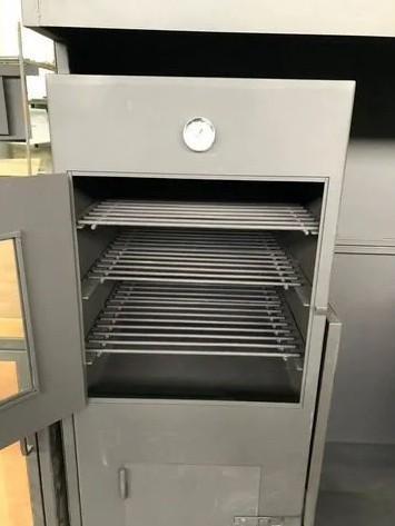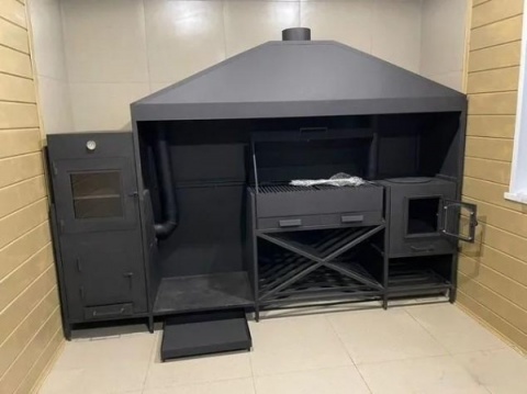 Центральная секция с мангалом и печкой под казан имеет комплект дымохода, вытяжной зонт. Горячая зона закрыта с 3 сторон, поэтому довольно безопасна. Мангал и печь под казан может легко и быстро накормить 12-15 человек на праздник или уютным семейным вечером. Печка вмещает казан до 16л , идёт в комплекте с кольцами. Коптильня довольно большая. Есть дверца со стеклом которая создаёт эффект камина. Для установки в доме нужен электрический дымосос, он удаляет абсолютно весь дым и запах. Тогда ы сможете готовить в доме шашлыки круглый год не открывая окон.