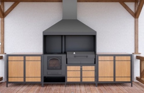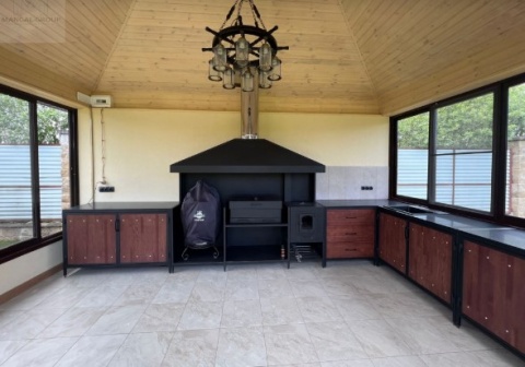 Уличная летняя кухня с мангальной зоной лофт. Доставка, установка в Москве, Подмосковье. Дальше только доставка. Эта летняя модульная кухня подойдет для для беседки, навеса, дома. Но для дома нужно будет сделать отдельную вытяжку. Цена зависит от комплектации, материала фасада, наполнения шкафов и размера.