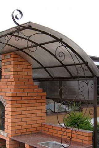 Навес для мангала, барбекю, мангала из металла и поликарбоната кованый для бачи, дома. Небольшой навес сделан из толстого металла, украшен коваными элементами: завитками, листьями. Сделан специально под этот мангальный комплекс. Поликабонат используем с высокой устойчивостью к УФ излучению. Крыша прорезана под трубу