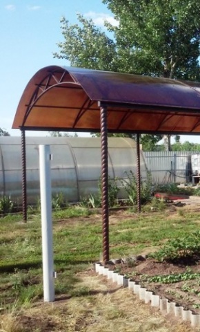 Сделан из качественного металла. Кованые столбы, стальные остальные части. Укреплен металлической фермой, которая сделана из квадратной профильной трубы, для окраски использована молотковая эмаль. Сверху качественный поликорбонат. Поликарбонат имеет высокую устойчивость к атмосферным факторам. Он не боится осадков, колебания температур и солнечных лучей, поэтому такой навес для мангала будет сохранять привлекательный вид на протяжении многих лет. Кроме того, материал этот недорогой по цене. И позволяет получить недорогой навес.