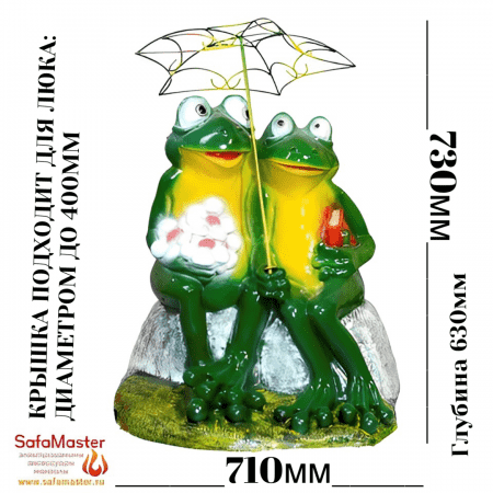 Декоративная крышка для люка, септика и колодца Две лягушки на камне - необычный вариант садового декора, который отличается крупным размером. Зонтик входит в комплект. Модель прекрасно впишется в любую обстановку и будет находится в гармонии со всеми статуэтками на вашем приусадебном участке.