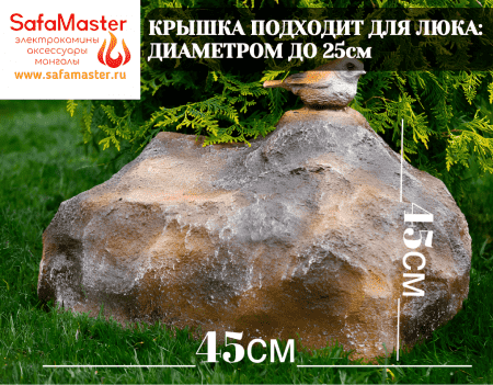Декоративная крышка на люк, для колодца, септика Камень с птичкой из стеклопластика скроет люки, колодцы, септики, ямы и неприглядные места на вашем участке. Изготовлена крышка из композитного материала - стеклопластика, влагостойкого и ударопрочного материала, по техническим характеристикам он сравним со сталью, а по теплоизоляционным с деревом. Лет 30 назад его использовали исключительно в кораблестроении и космической отрасли. И создан был он именно для нее. Стекловолокно, которое он содержит армирует материал и помогает сохранять структуру.