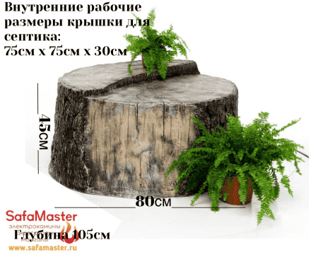 Декоративная крышка септика в виде пня изготавливается из стеклопластика - ударопрочного, влагостойкого материала, который максимально точно передает текстуру изделия, что позволяет модели выглядеть реалистично и естественно. Преимущества крышки септика - она обеспечивает дополнительную теплоизоляцию, необходимую для поддержания приемлемой температуры в холодное время, за счет воздушного кармана под ней. Специальные отверстия обеспечат циркуляцию воздуха.