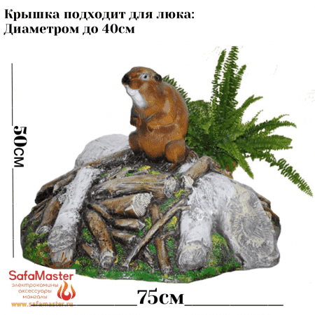 Крышка люка с оригинальным дизайном, представляющим из себя небольшого бобра сидящего на плотине. Материал изготовления - стеклопластик, устойчивый к перепадам температур и атмосферным осадкам.
