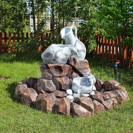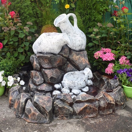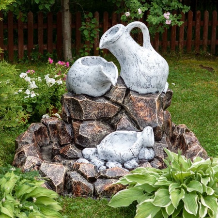 Фонтан для сада является одновременно и декоравтиным и функциональным. Вода как будто выливается из одного кувшина и устремляется вниз, создавая эффект потока. Фонтан оснащен помпой, с помощью которой и происходит циркуляция воды. Для установки и подключения необходимы электричество и вода. В нижнюю чашу фонтана наливается вода, которая через некоторое время будет подниматься по внутреннему устройству с помощью помпы в верхнюю точку фонтана и спускаться вниз по скульптуре.