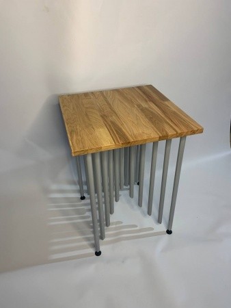Такая модель журнального столика в наличии. Но под заказ можем сделать размер больше/меньше, добавить конструктивные элементы, выкрасить металл в нужный цвет и подобрать столешницу другого цвета.