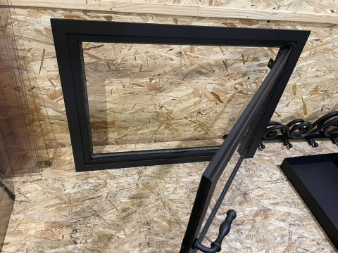 Дверца для камина кованая черная с огнеупорным стеклом делается под заказ по индивидуальным размерам. Ручка может быть в любом удобном месте. Стекло выбираем самое лучшее, немецкое или японское. Такое стекло выдерживает огромные температуры и имеет гарантию.