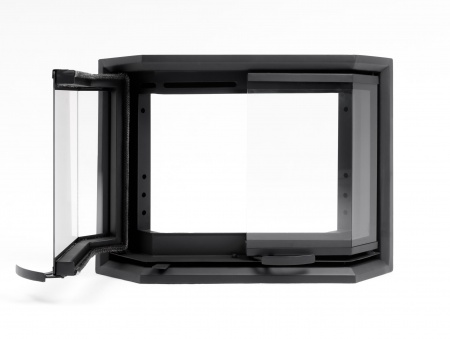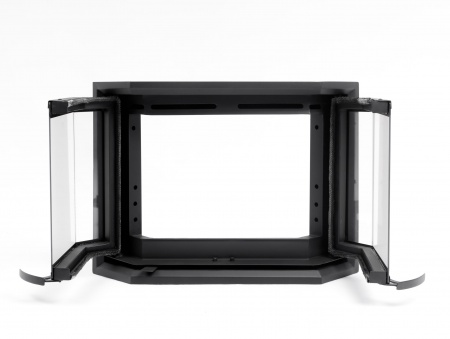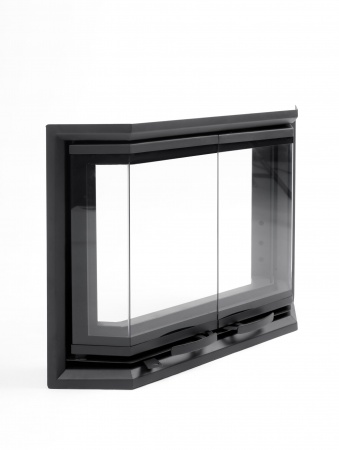 Каминная эркерная дверца модель «Призма» посадочные размеры кладки 701х490 мм, с обналичником 27 мм, дополнительный обдув, черного цвета, двустворчатая без перемычки по центру в наличии на нашем складе.